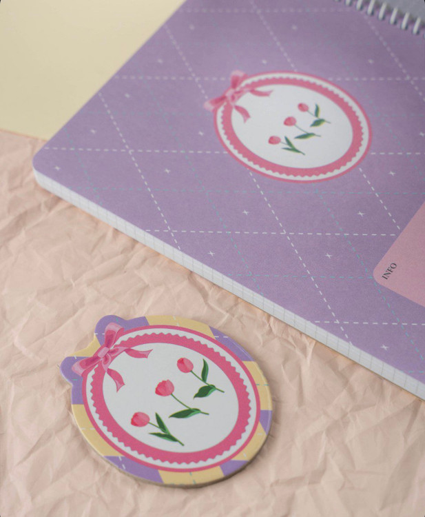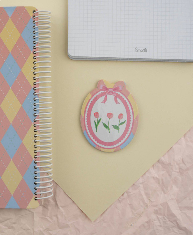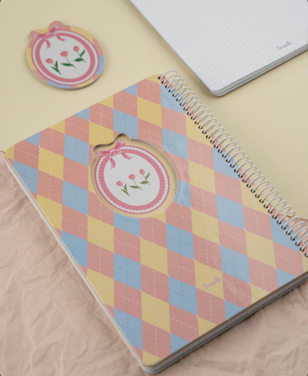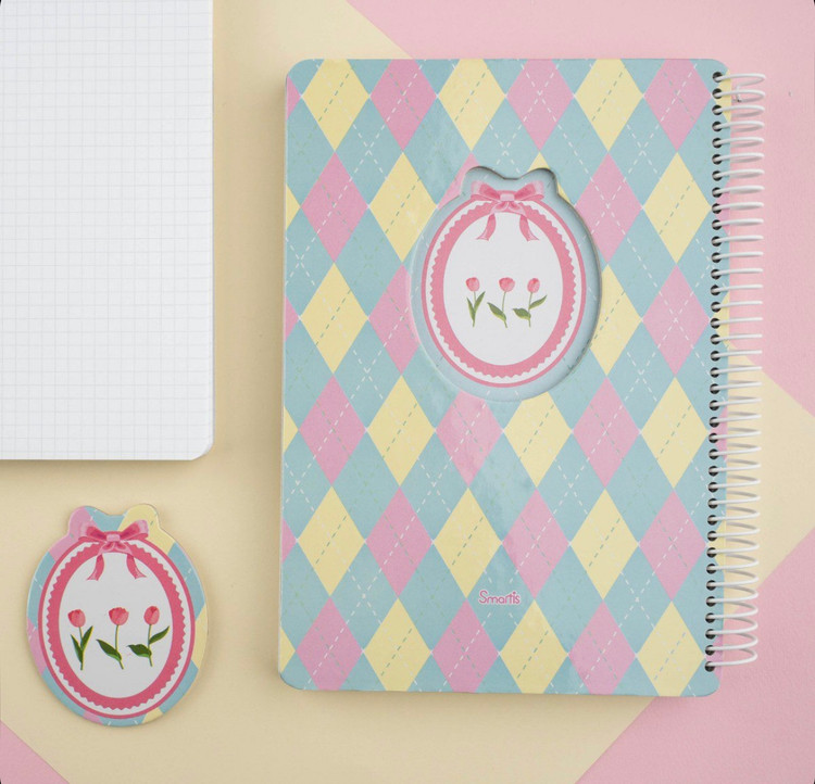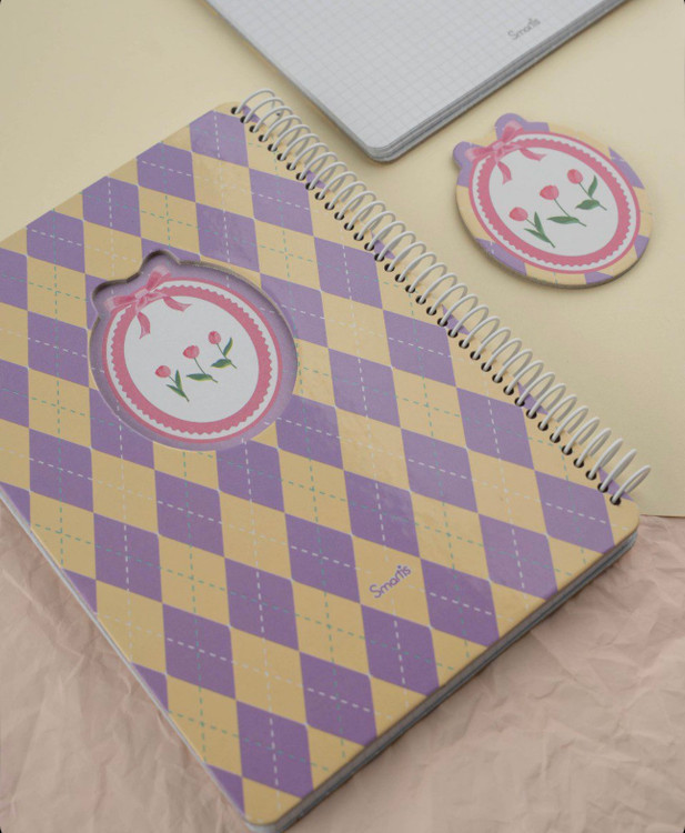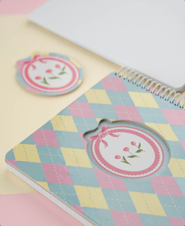 - توضیحات : دفتر دو جلدی که روی جلد سختش پنجره داره و زیر لاله های خوشرنگ دیده می شه / دفتر شطرنجی